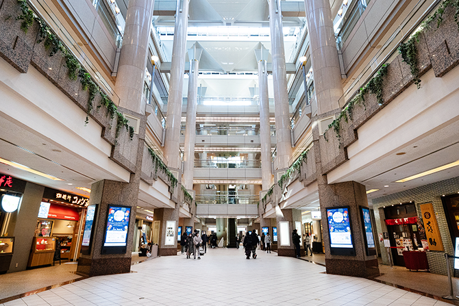 ショッピングゾーンに囲まれた空間。各種プロモーションなどに対応する館内スペース。5Fまで吹き抜けのショッピングモール“ランドマークプラザ”1Fに位置するフェスティバルスクエアは、みなとみらい駅からの往来も多く、つねに注目を集めるスペースです。