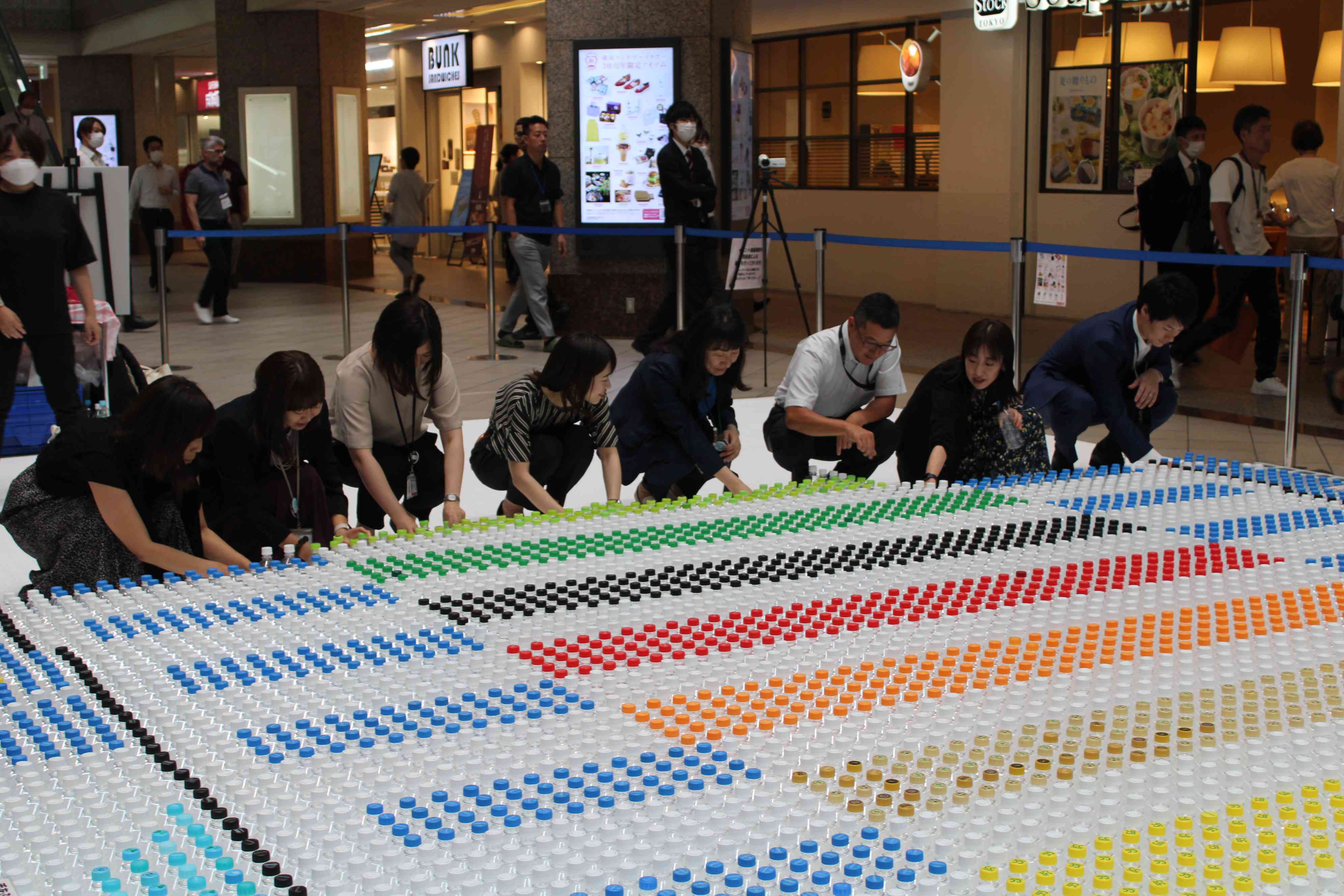 2023年7月11日(水)~7月15日(土)の期間、横浜ランドマークタワー・ランドマークプラザの就業者やお客様等から回収したペットボトルを使用し、世界最大サイズのモザイクアートを出現させる「ペットボトルで作った最大のモザイク(イメージ)/Largest plastic bottle mosaic (image) 」に挑戦しました。