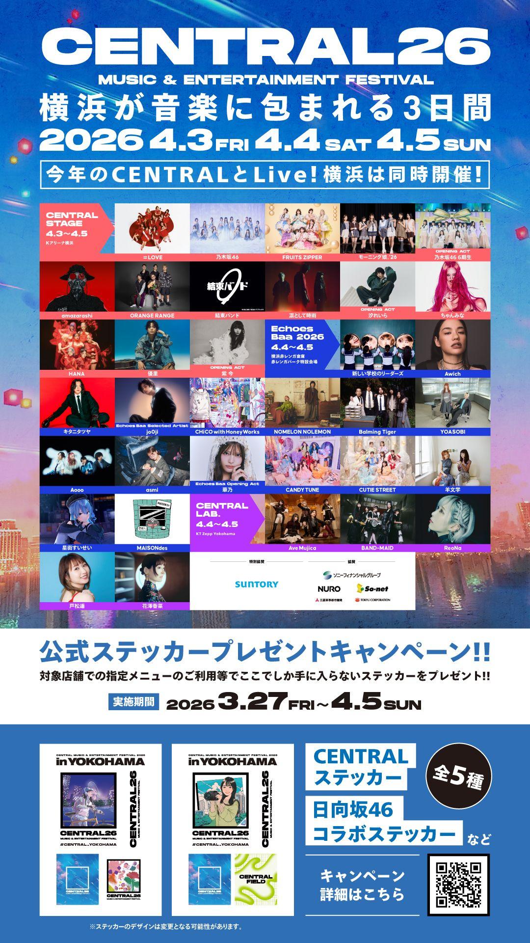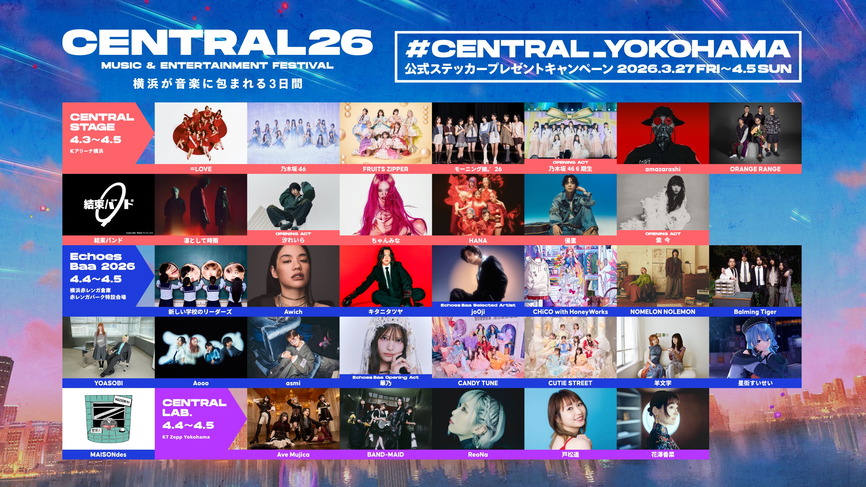 新たな都市型フェス『CENTRAL MUSIC & ENTERTAINMENT FESTIVAL 2026』が、Kアリーナ横浜、KT Zepp Yokohama、横浜赤レンガ倉庫、臨港パークで開催されます。