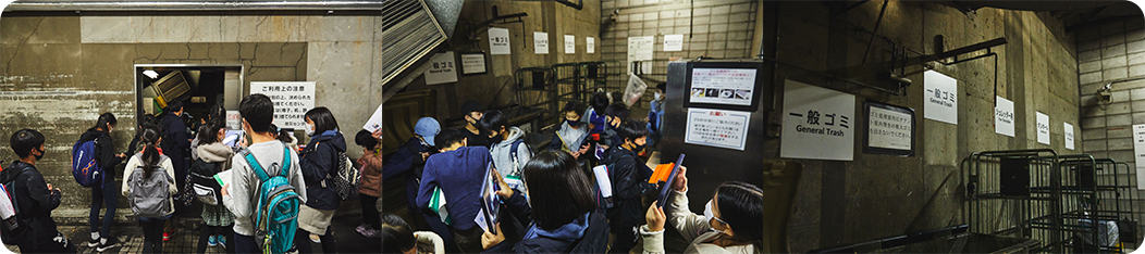 - 地下にある塵芥処理室で、排出されたゴミを最大限リサイクルするために、細かく分別されている様子を見学。横浜ランドマークタワーでは、2019、2020年度は、資源化率30%を超え、特に生ゴミは、Jバイオフードリサイクル(株)に依頼し、再生可能エネルギーとしてリサイクルしています。