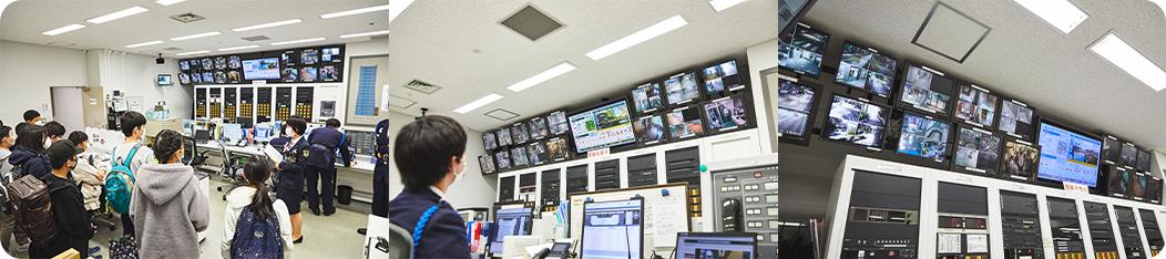 防災センターでは、常に煙感知器や非常放送、非常照明などの各種防災機器の作動状況や、エレベーターやエスカレーターの運行状況、館内200カ所に設置されたカメラによって建物内の状況の確認を行っています。また、館内を巡回して異常がないか、日々点検しています。