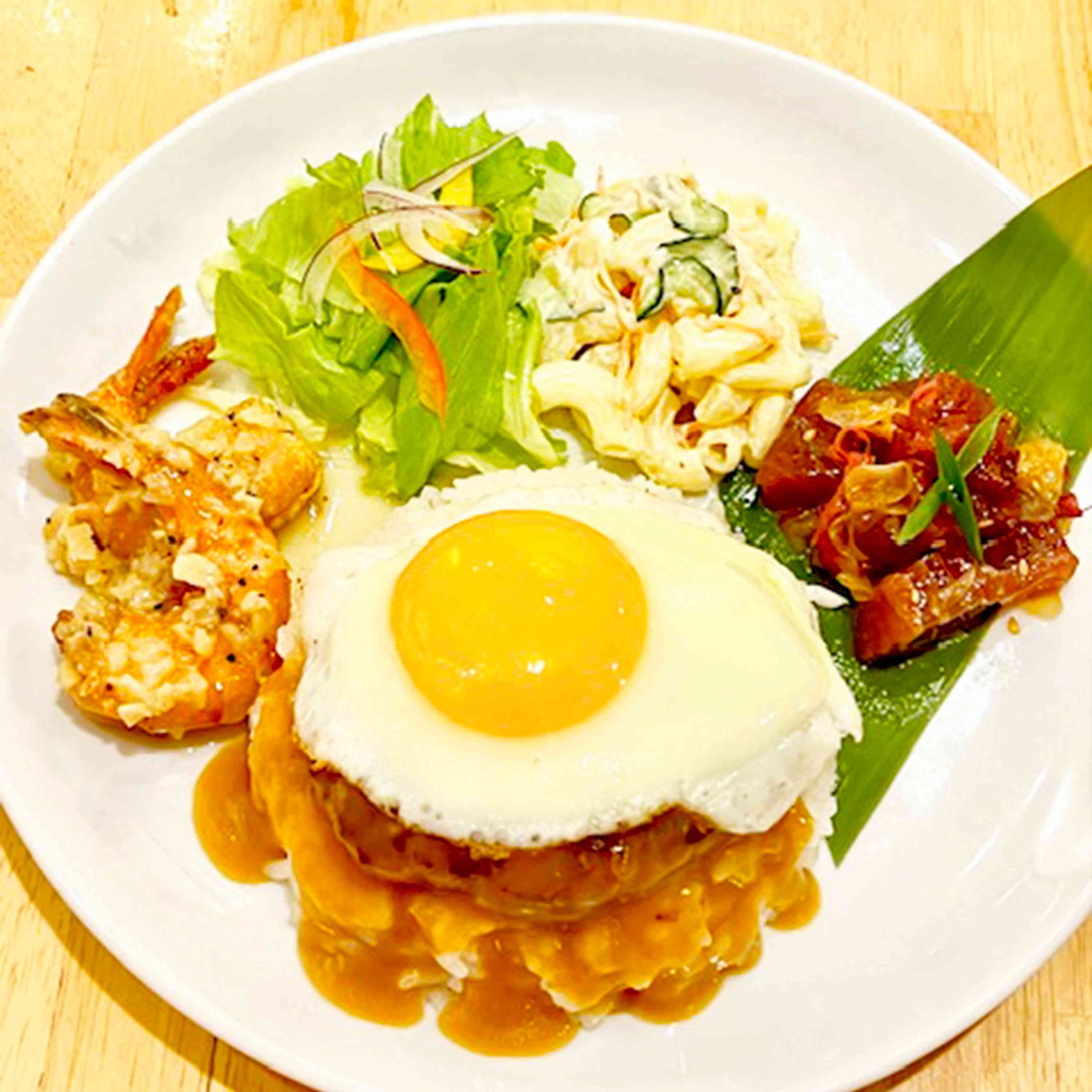 ハワイアン・ロコフードからエスニック、アメリカンを感じる手作りの料理の数々と、焼き立てのワッフル、チーズケーキやアップルパイ。