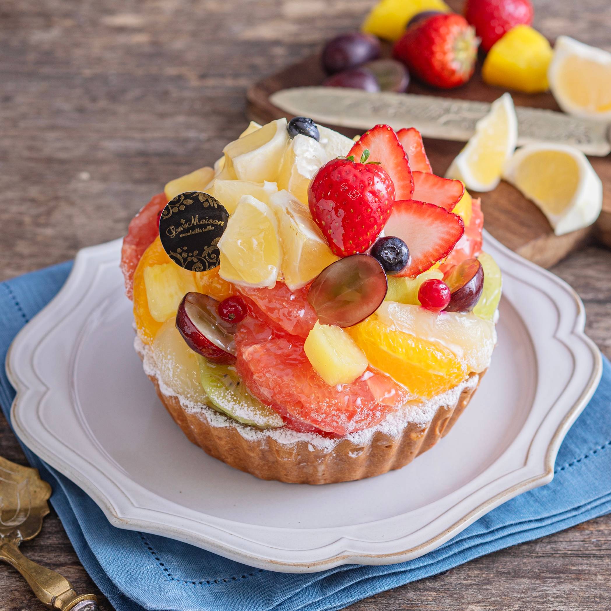 香ばしいアーモンドタルトにカスタードクリームとホイップクリームを重ね、いちごジャムをアクセントにしのばせました。甘く爽やかな酸味の日向夏とあまおうなど10種類のフルーツを贅沢に使用し、彩り鮮やかに飾りました。