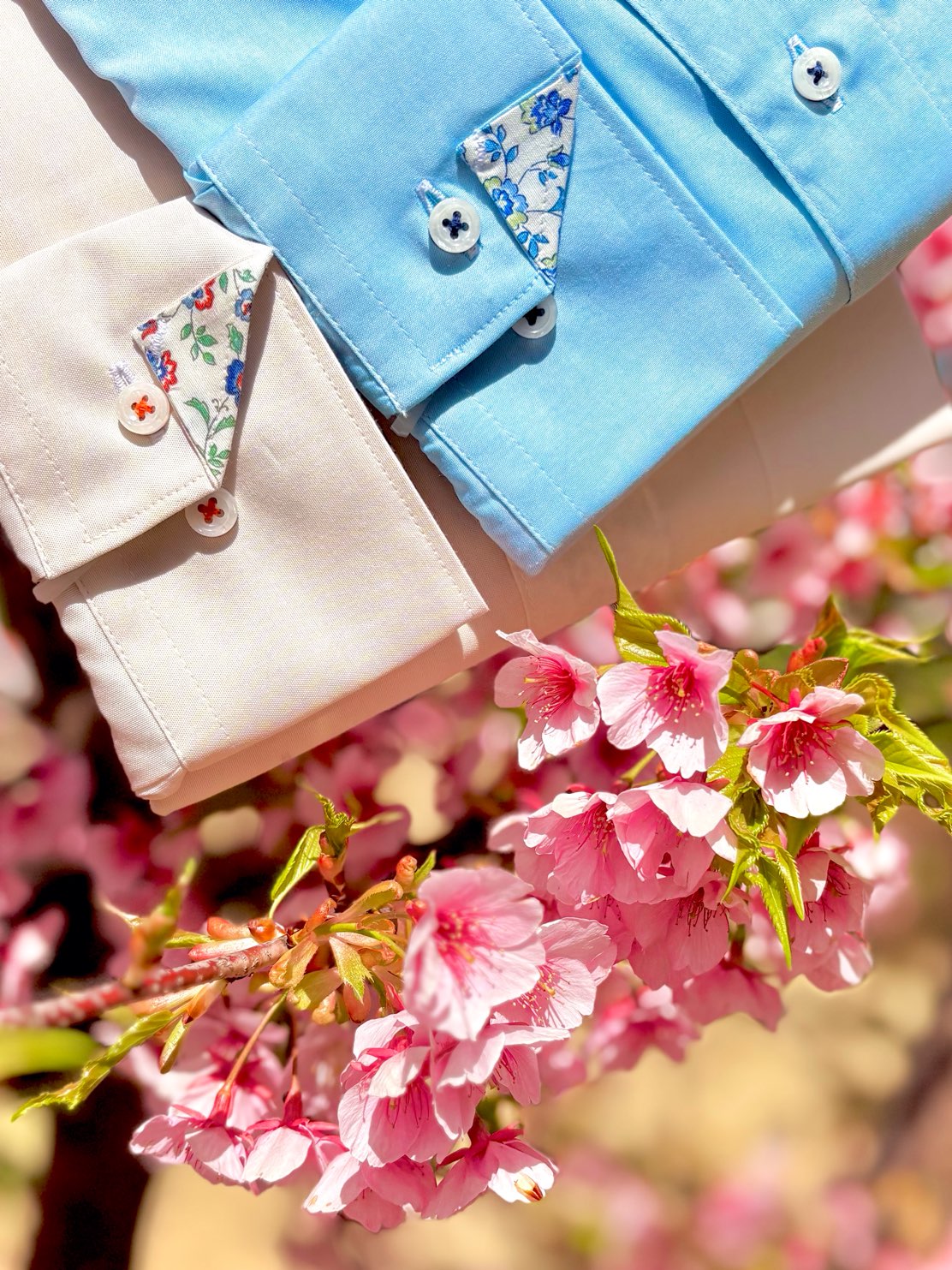 カラーはライトブルーとベージュ。それぞれ花柄の裏地を組み合わせて爽やかに仕上げました!