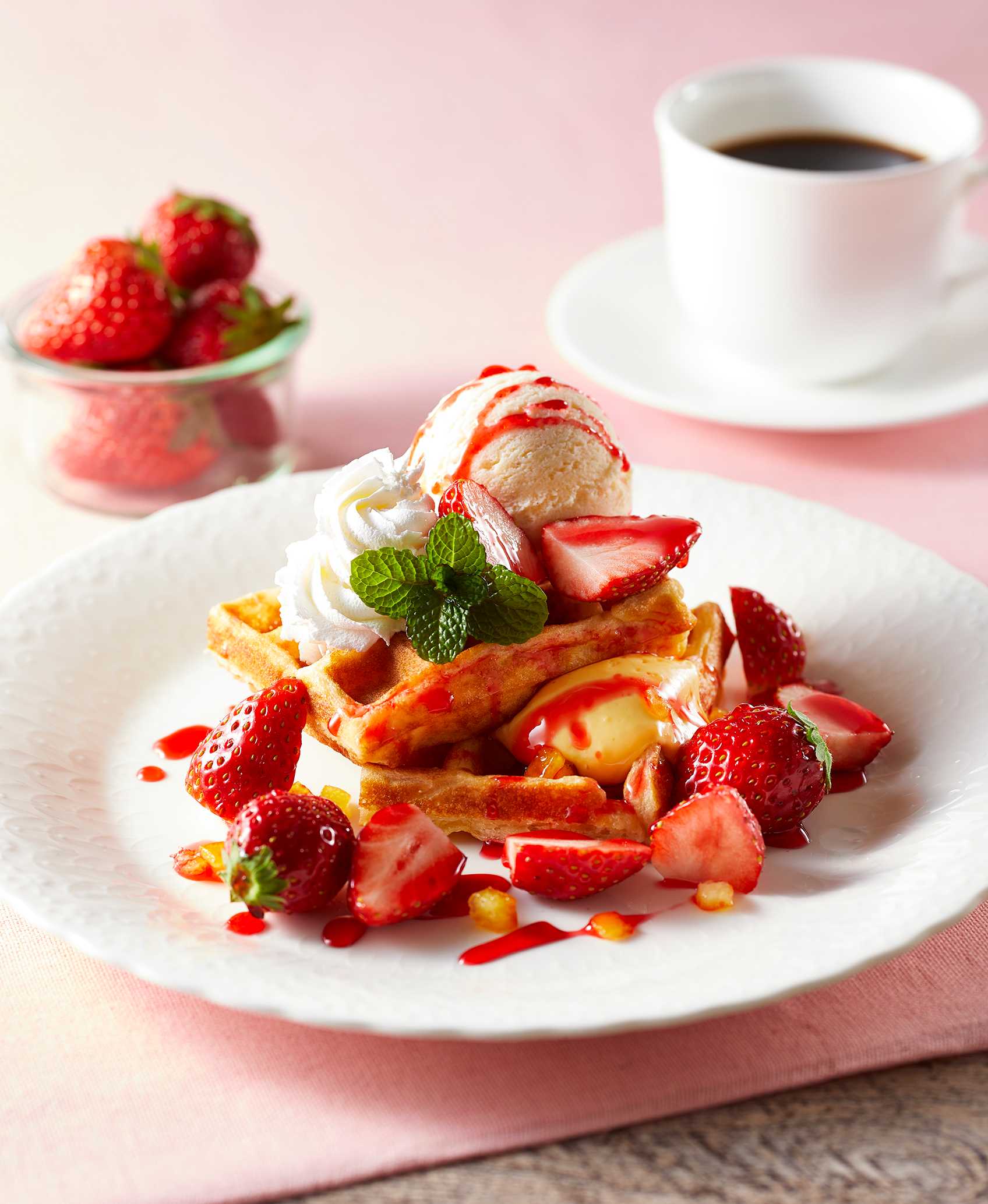 焼き立てワッフルにたっぷりの苺をトッピング、甘酸っぱいソースがアクセントの季節限定デザートです。