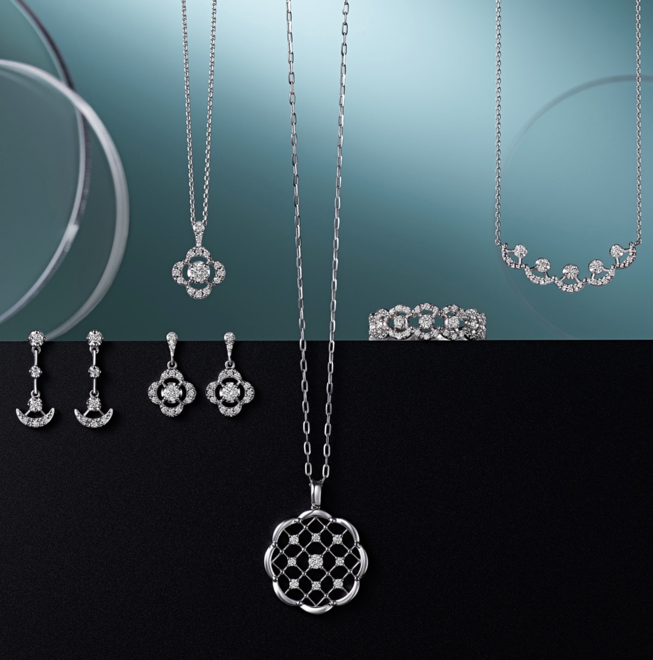 センターダイヤモンドから溢れる輝きはモチーフに華やかさをまとわせ、メレダイヤのきらめきは柔らかなシルエットを際立たせます。
