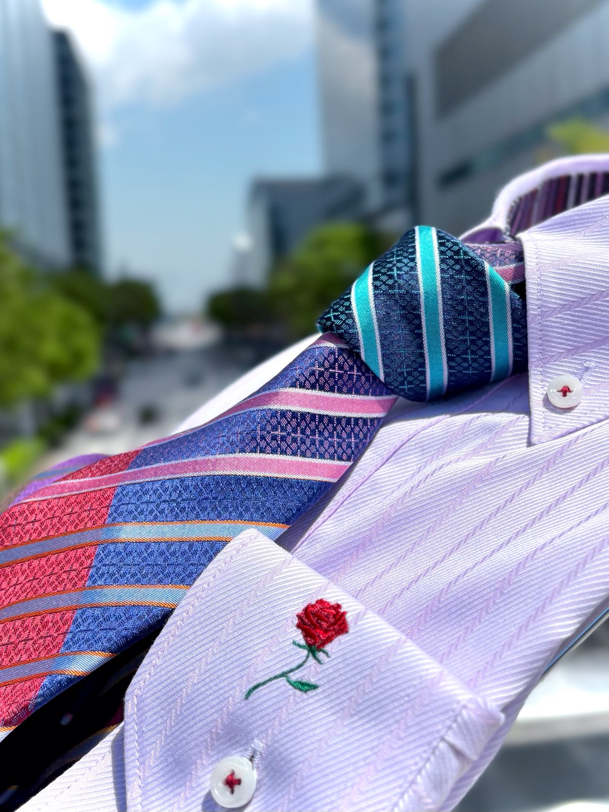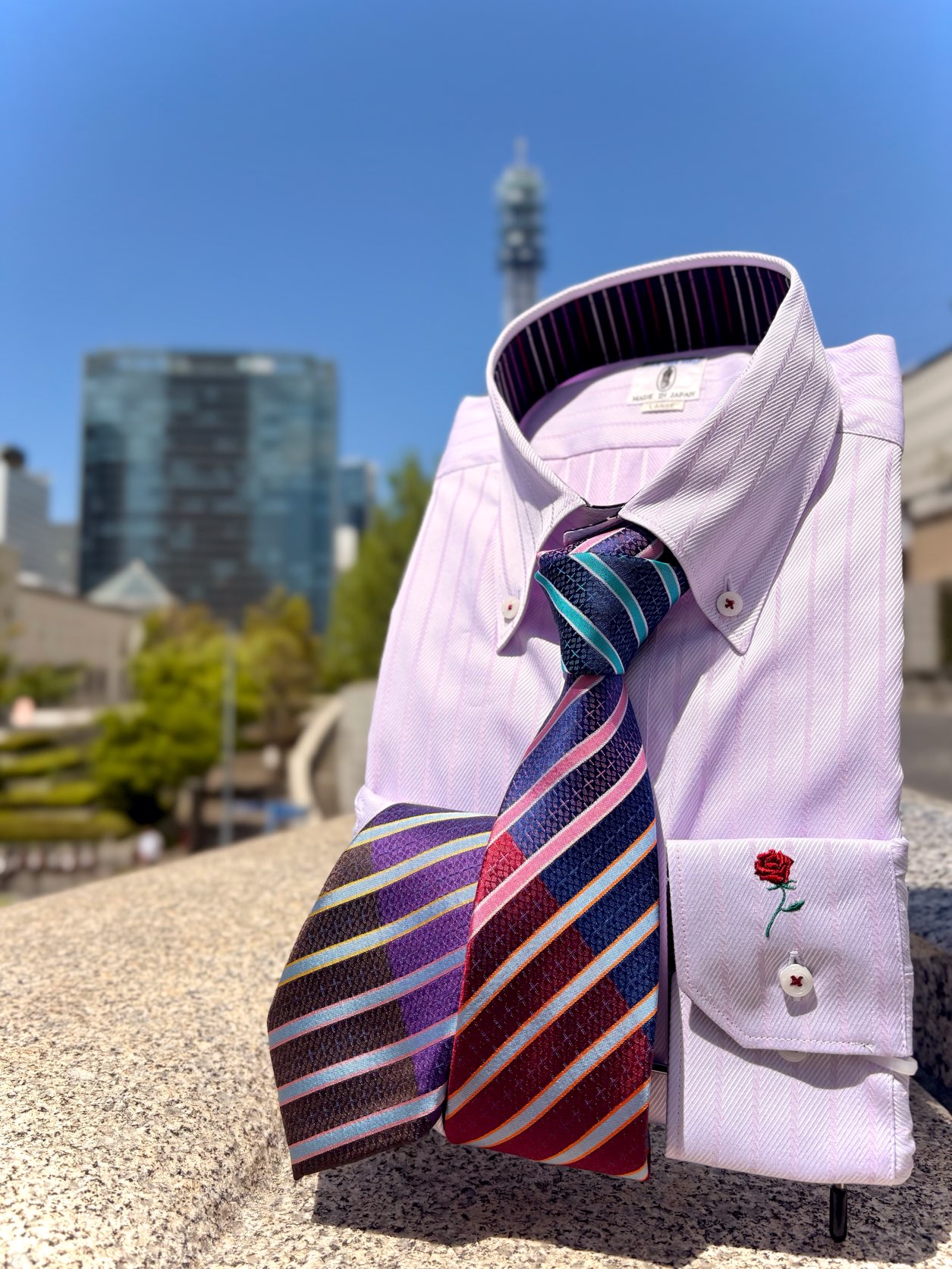 ホワイトには当店オリジナルの第二ボタンにつけるアクセサリー、ルーズレスボタンを付けています。これからのノータイの時期にとてもお洒落です!ピンクのシャツには以前もご紹介した老舗シルク工場のVANNERSのネクタイでコーディネートしてみました!こちらの特別なネクタイもオススメです。